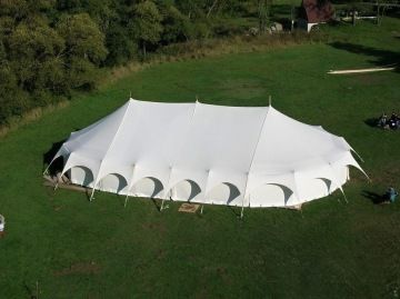 Kompletní obloukové šapito 12 x 24 m vyrobené z bavlněné stanové látky 360 g. Stan tedy kromě plachty obsahuje také tyče a doplňky. Tento stan byl vyroben v roce 2021 a od té doby byl využíván pro pronájmové realizace.