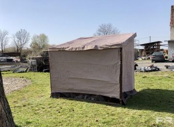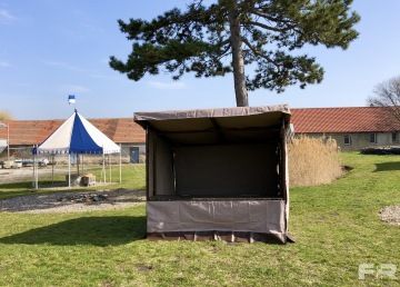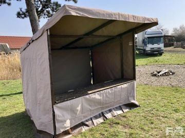 Prodejní stánek Shop o rozměrech 2,5 x 2 m. Plachta je vyrobena z polyesteru 430g v pískové barvě. Konstrukce stánku je vyrobena z bukového dřeva a je natřena tmavě hnědou barvou.