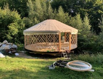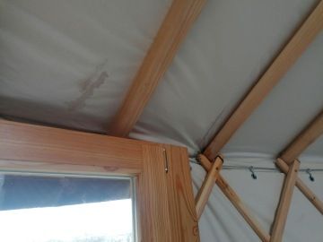 Použitá vnitřní plachta pro 8m jurtu vyrobená z bavlněné stanovky 300 g. Plachta byla krátce používána na jedné z námi instalovaných jurt, nicméně došlo k jejímu zašpinění (viz fotografie níže) a byla vyměněna.